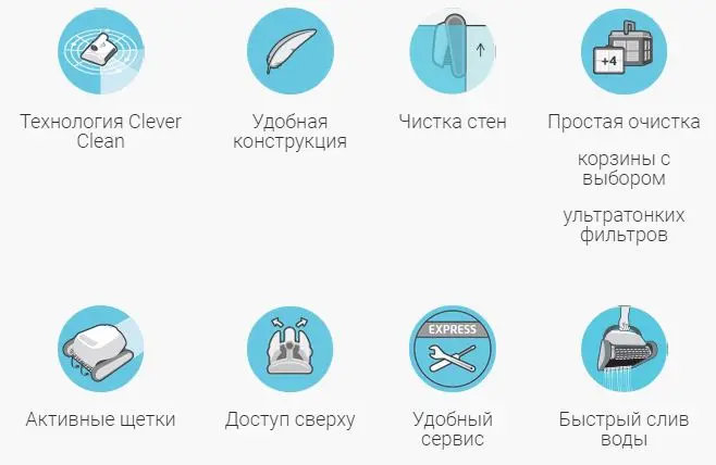 Подходит для любых типов бассейнов. Имеет быстрый сброс воды и прост в обслуживании и эксплуатации. Чистит дно бассейна, стены и линию воды.