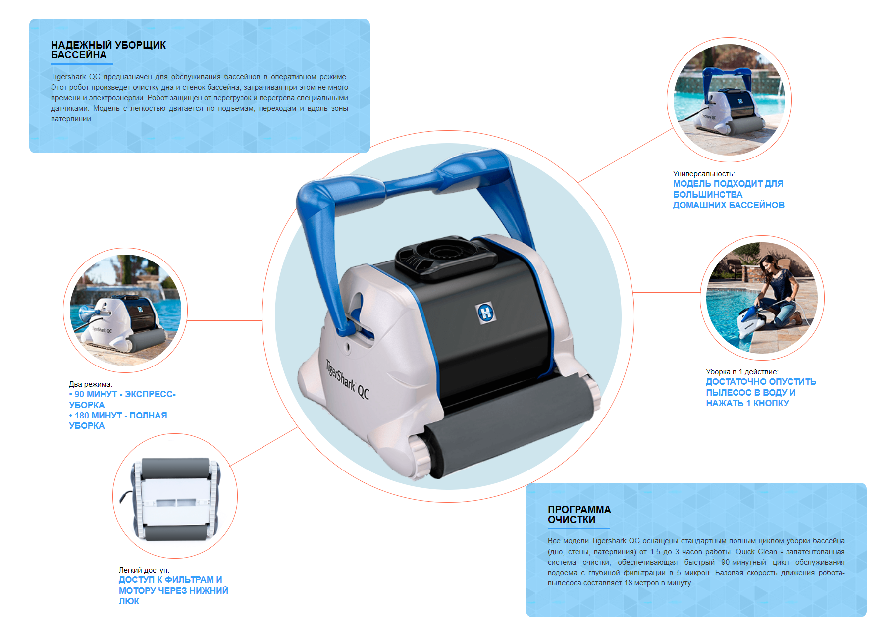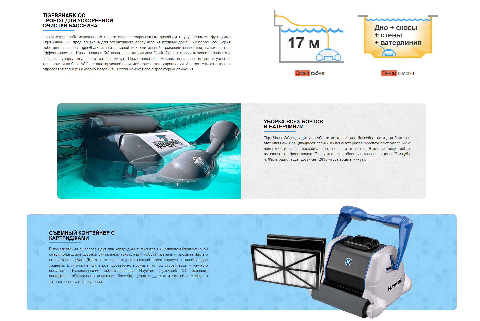 Робот Хайвард Tigershark QC представляет собой универсальное решение для быстрой очистки домашних бассейнов. Запатентованная технология Quick Clean позволяет убирать бассейны за 90 минут. Tigershark QC расходует минимум электроэнергии, выполняя при этом большой объем работы по обслуживанию водоема. Производительность пылесоса Tigershark QC достигает 300 метров квадратных в час. Tigershark QC с очищающими резиновыми валиками - является оптимальным решением для бассейнов с лайнерным покрытием.