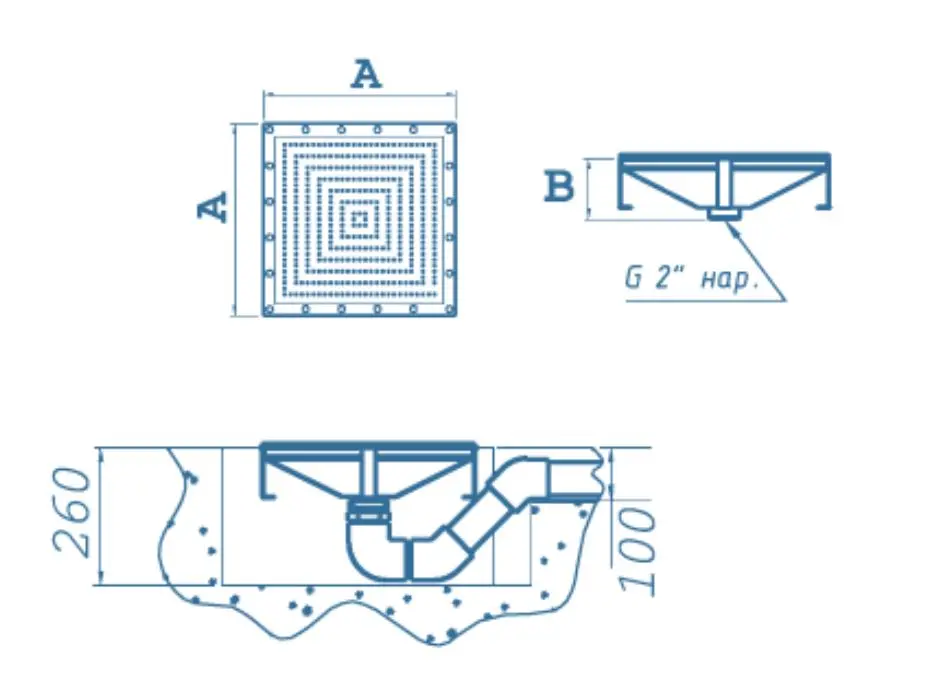 Плато 400х400мм имеет подсоединение с резьбой 2" наруж.