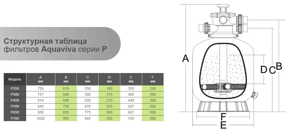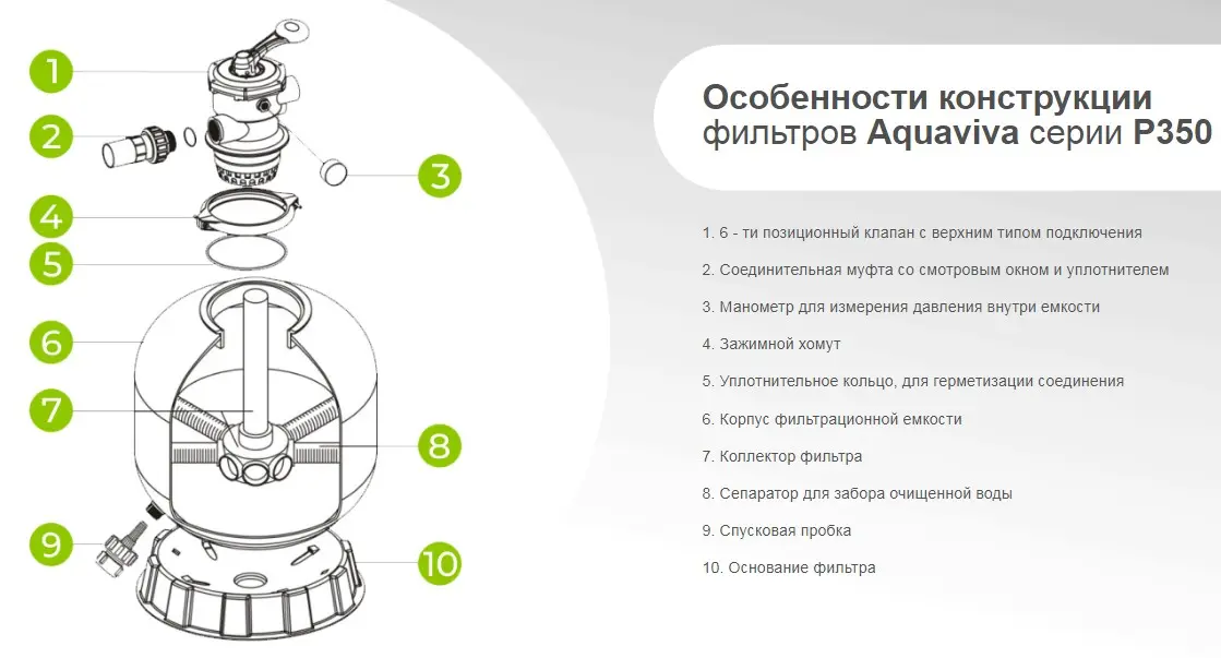 Приобретая фильтр Aquaviva серии P обратите внимание, песчаная засыпка и циркуляционный насос не входят в комплект поставки фильтра (приобретаются отдельно).