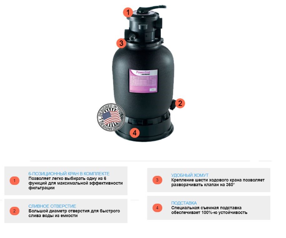 Насос фильтровальной установки Hayward PowerLine всасывает воду чаши бассейна через скиммеры, донные сливы или переливные лотки и перегоняет ее под давлением обратно в бассейн через фильтр. Фильтрацию воды необходимо производить каждый день, независимо от того, используется бассейн или нет. Время фильтрации рассчитывается, исходя из условий трехкратного прохождения объема воды бассейна через фильтр в течение суток.