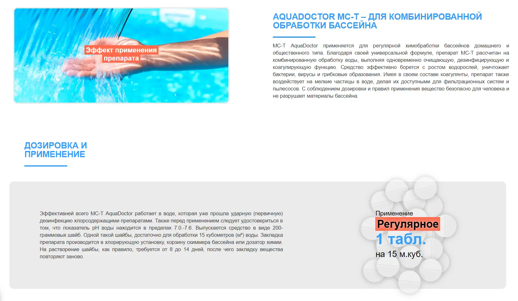 • Регулярная обработка: 1 таблетку на 15 м³ воды раз в 8-14 дней.
