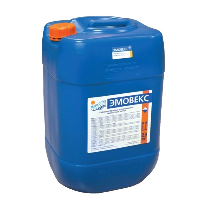 "Эмовекс" - чистый концентрированный раствор хлора, наилучшее средство из жидкой химии для бассейна, незаменимый помощник, обеспечивающий полную дезинфекцию воды и осуществляющий её защиту от бактериальных загрязнений; позволяет получить чистую прозрачную воду, лишенную водорослей и бактерий, предупреждает образование известкового налета. Содержание активного хлора в этом продукте 135 - 140 граммов на литр, расфасован в тридцати-литровые канистры (товарный вес - 34 кг), идеально подходит для установок автоматического дозирования химии.