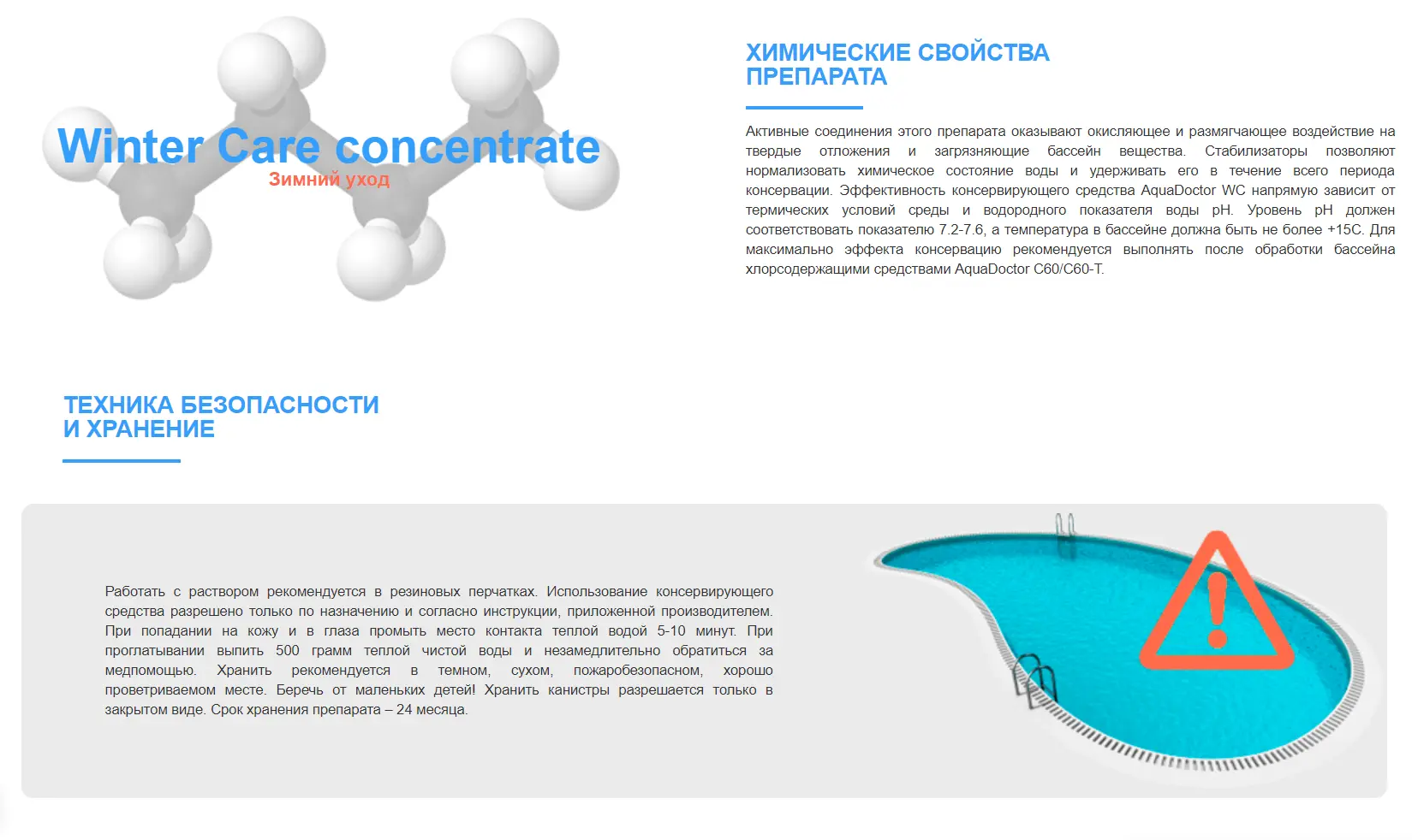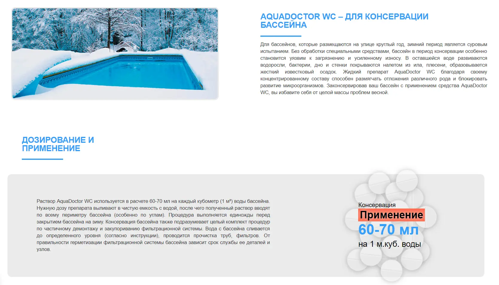 • Дозировка: 60-70 мл раствора на 1 м³ воды в бассейне