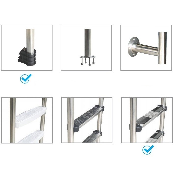 Ступени с противоскользящими накладками отлично подходят для комфортного спуска в бассейн. Крепятся к поручням с помощью болтов. Все элементы выполнены из нерж. стали.