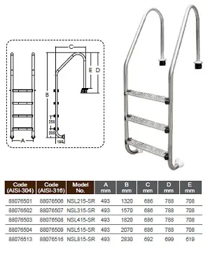 Лестница серии NSL (Standart) китайской компании Emaux предназначена для частных и коммерческих бассейнов с широким бортом, а также для бассейнов с переливным лотком.