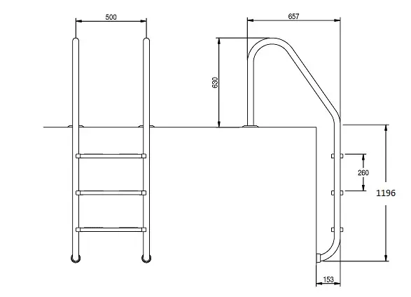 Нижняя часть лестницы упирается в стену бассейна резиновыми заглушками, не нарушая гидроизоляции чаши бассейна.