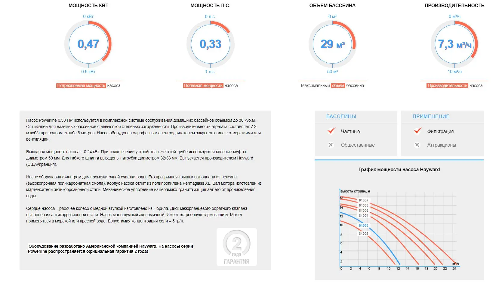 Насос серии Powerline испанской компании Hayward предназначен для циркуляции воды в системе фильтрации бассейна.