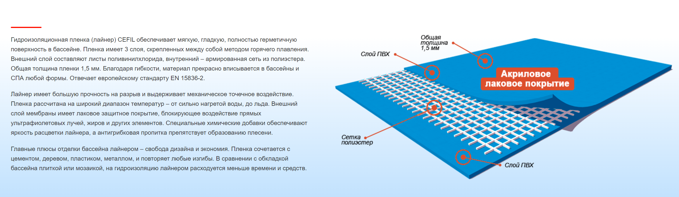 Армированная ПВХ пленка марки Cefil является идеальным решением для внутренней гидроизоляции любого бассейна. Отлично подходит для использования с любой водой и выдерживает любые погодные условия и перепады температуры, что очень важно для уличных бассейнов.