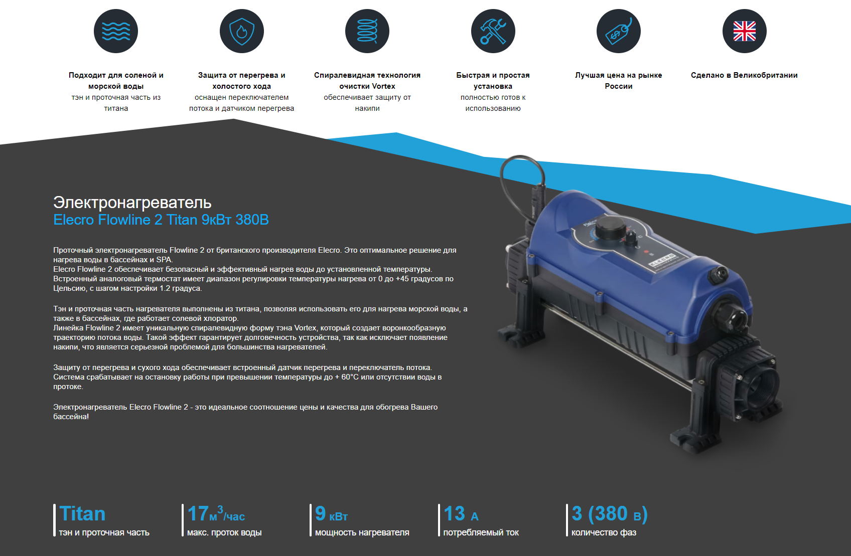 ТЭН и проточная часть изготовлены из сплава титана, что позволяет использовать нагреватель с соленой водой. Спиральная конструкция ТЭНа исключает появление накипи. В комплекте имеются все крепления и подсоединения для монтажа.