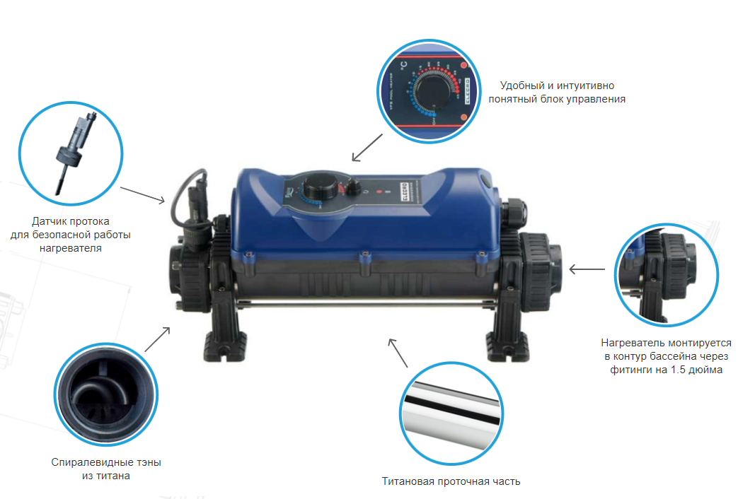 Водонагреватель для бассейна имеет встроенный термостат на корпусе для контроля температуры воды. Оснащен реле защиты от перегрева. Датчик потока оберегает электронагреватель при случаях работы с низким напором или с выключенным насосом фильтрации.
