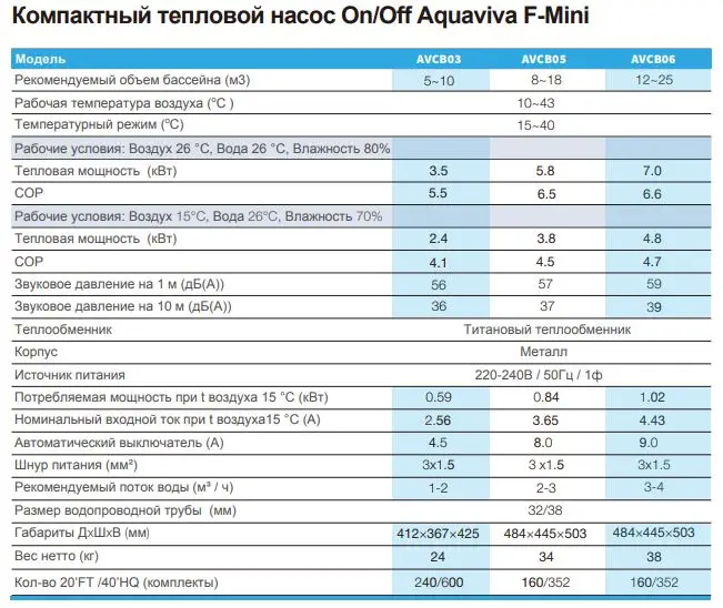 Тепловые насосы Aquaviva серий F-Mini AVCB — это линейка решений для эффективного нагрева воды в частных бассейнах разного объёма. Устройства идеально подходят для обслуживания детских и каркасных бассейнов, гидромассажных ванн, а также бассейнов со стальными стенками.