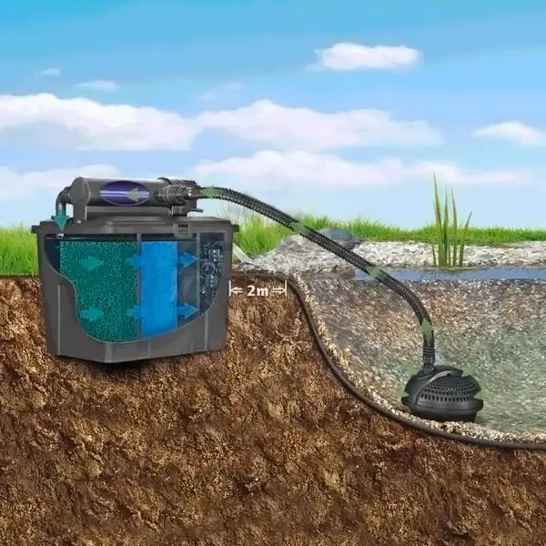 Фильтр безнапорный Pontec MultiClear Set 8000 - это готовый к подключению комплект фильтрации, с помощью которого вы добьетесь прозрачной, чистой и здоровой воды в прудах. Благодаря индикатору уровня загрязнений и донному сливу, обслуживание очень удобное и простое. Приобретая фильтры от производителя Pontec, вы создаете благоприятные условия вашим водоемам. Устанавливать комплект можно двумя способами. Первый – просто на берегу. Второй – прикапывая и при этом, не заглубляя уровень слива.